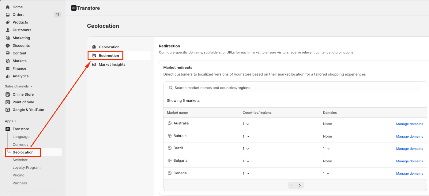 Please go to Geolocation Navigation in Transtore -> Redirection: