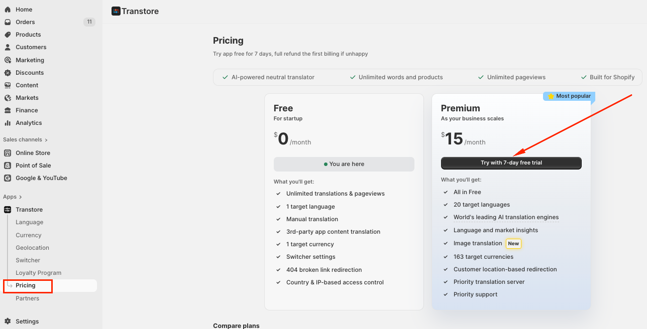 This trial allows you to explore how Transtore supports localization, currency conversion, and market-based experiences for international customers, so you can decide whether it’s the right fit for your store.