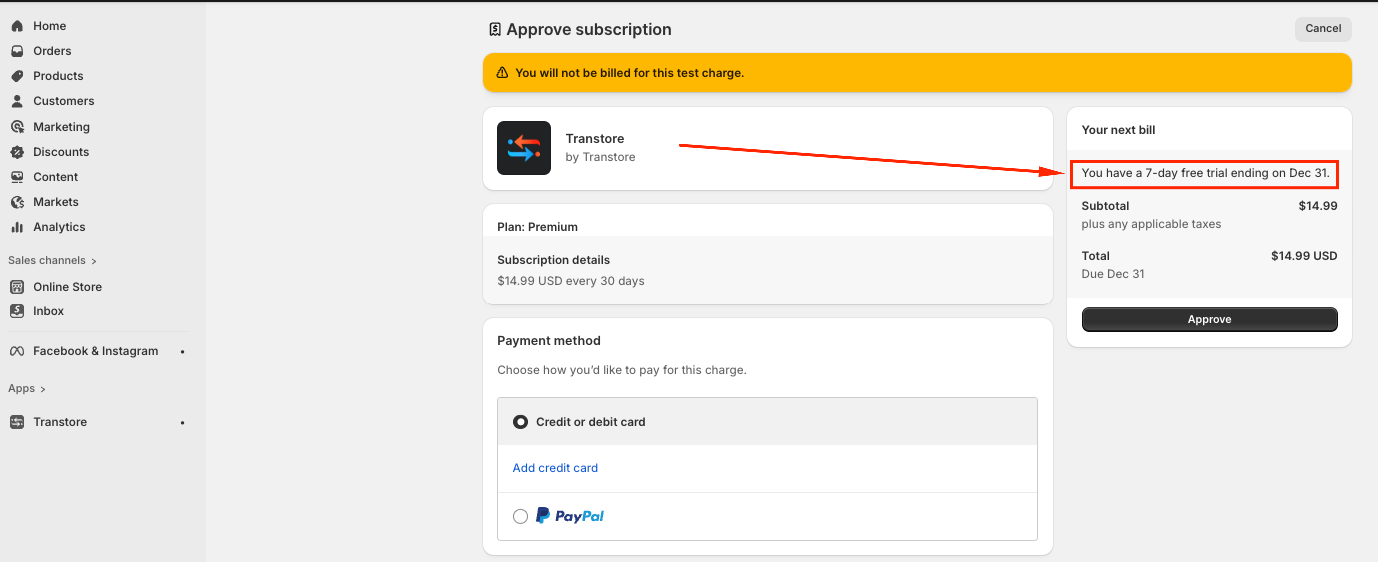 Shopify will ask you to approve the charge, but no payment will be made during the trial