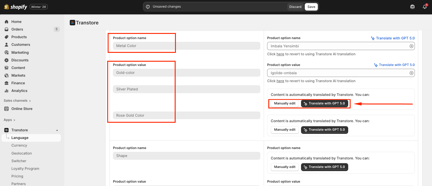 Transtore supports manually editing product variant translations such as Size, Color, Material, or Gender directly in the app.