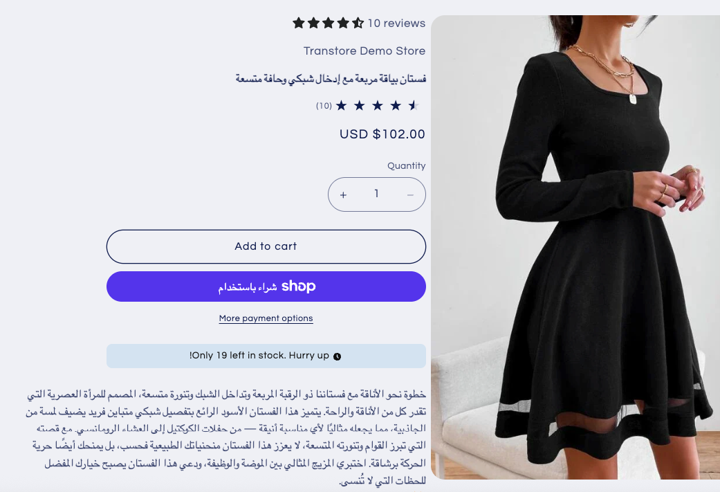 Displaying content in right-to-left (RTL) format helps create a more natural and familiar shopping experience for customers using languages like Arabic or Hebrew. Transtore supports RTL format and ensures the translation is shown correctly, depending on your Shopify theme’s capabilities.