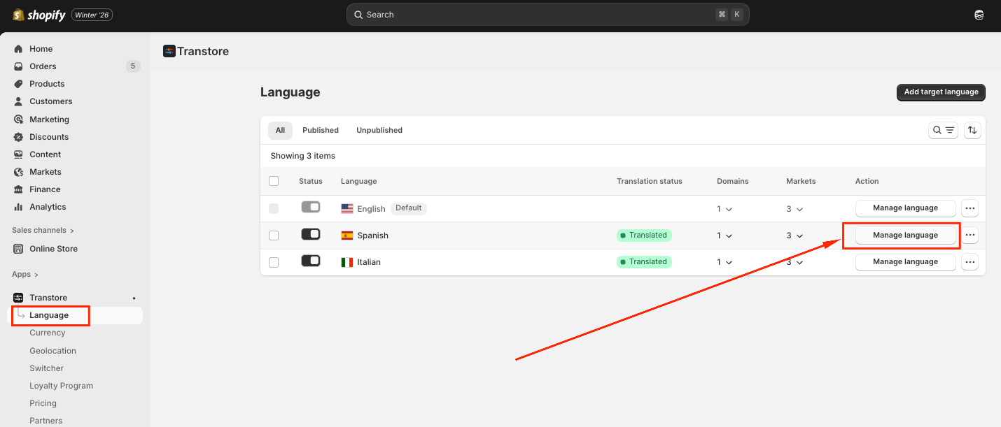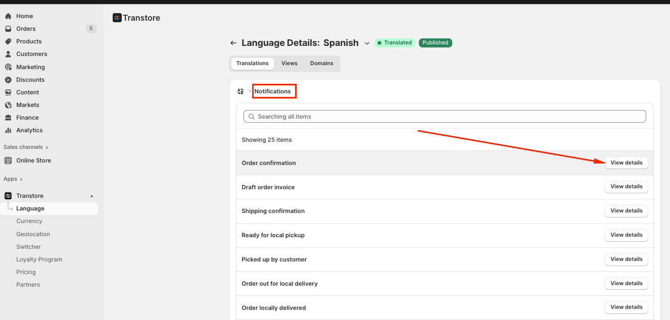 Transtore supports translating order and email notifications that are generated directly by Shopify. This helps you deliver a localized post-purchase experience to customers in different languages.