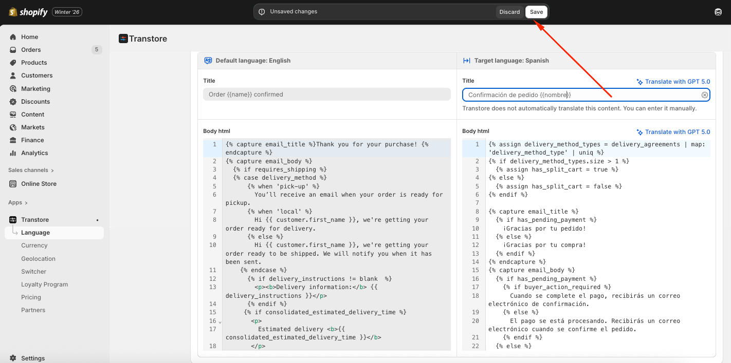 - Transtore only supports editing the translated text. When translating notifications, you must keep Shopify’s original notification template structure intact. Do not adjust the code inside the template in Transtore.