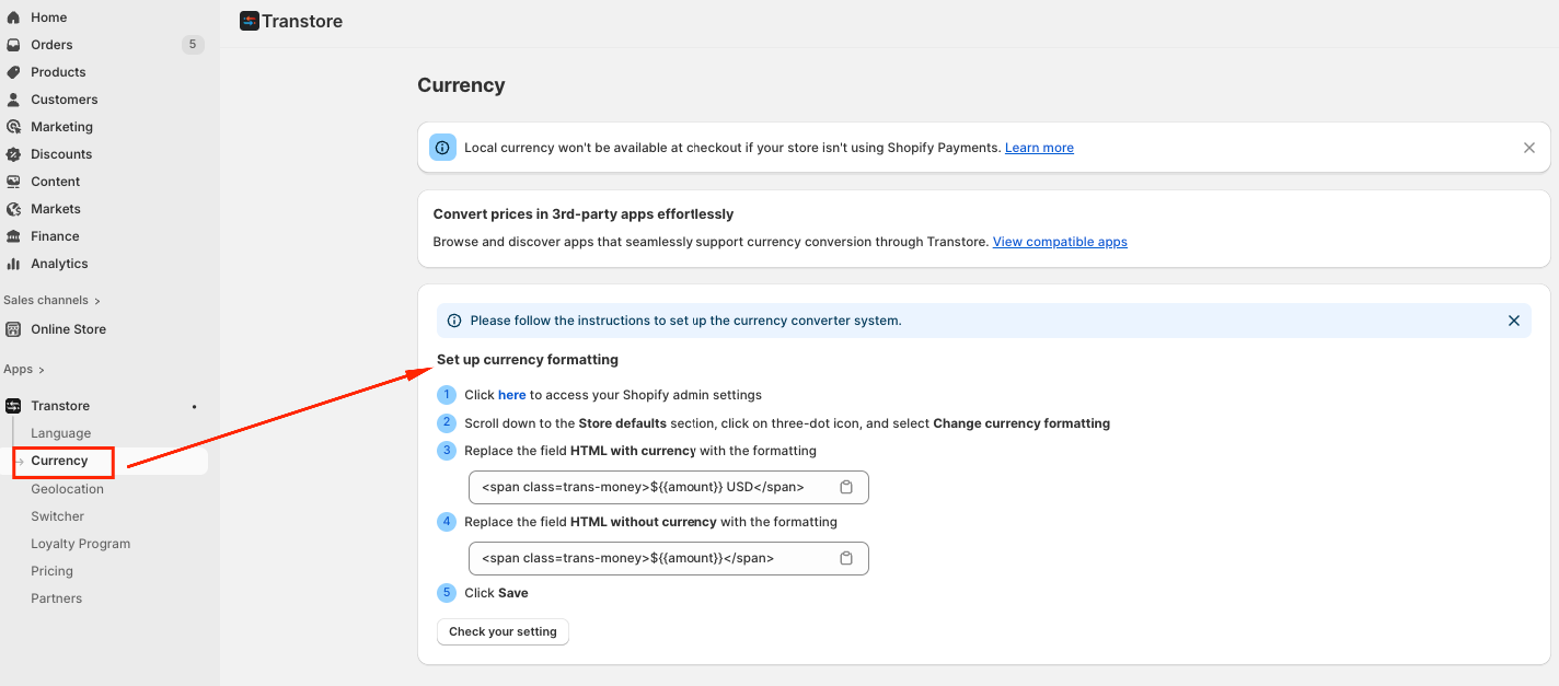 Please go to the Currency section and follow the instructions here to paste the code in your Shopify currency format settings. Once it’s done, please go back to the back and click on “Check your settings”: