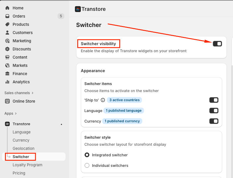 The most common reason the switcher doesn’t appear is that the Transtore app embed is turned off in your theme.