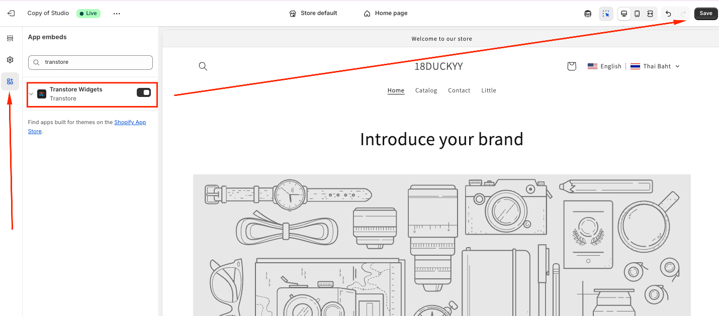 (2) Choose the "App embeds" tab -> Toggle ON the "Transtore" app embed and Save: