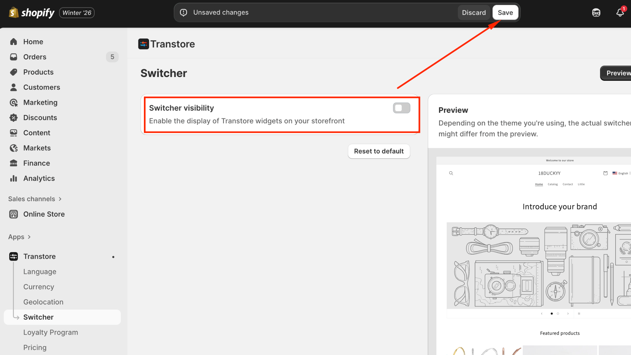 If you’re not ready to show languages or currencies on your storefront yet—such as when you’re still preparing translations or configuring currencies—you can temporarily hide the Transtore switcher from visitors.