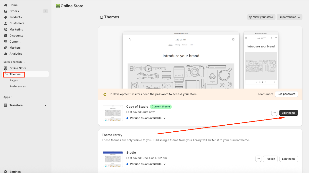 1) From your Shopify admin, navigate to Online Store → Themes -> Click on Edit theme: