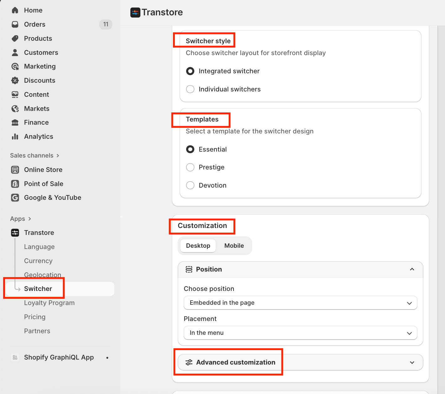 Learn how to set up the Transtore switcher on your storefront